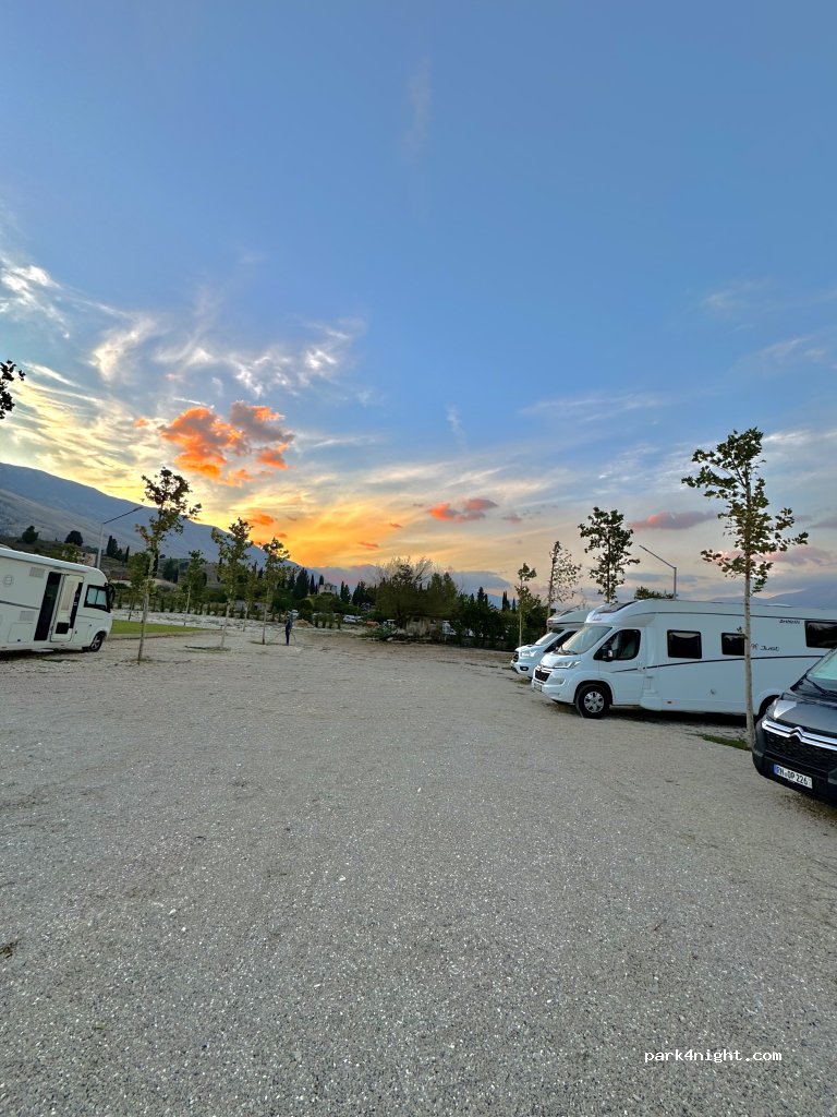 Gepflasterter Parkplatz mit allen Services. Nette Besitzer. Perfekt für einen stop in der Altstadt von Gjirokastra. Schatten gibt es nicht. Aber wir kamen spät und fuhren früh. Wir haben ein Taxi in die Altstadt genommen. Lohnt sich. Es geht sehr stark Berg auf.