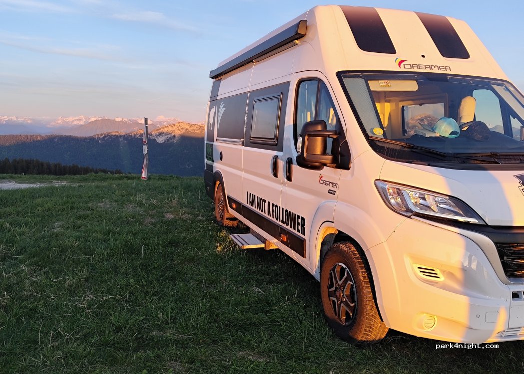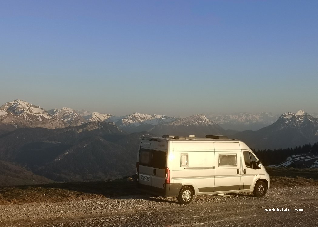 Parking où nous sommes autorisés. Vue magnifique sur 360°, vallées, Mont Blanc, couché de soleil. Calme, de belles balades, produits locaux. Merci de respecter ce lieu magnifique si on veut pouvoir en profiter encore longtemps.