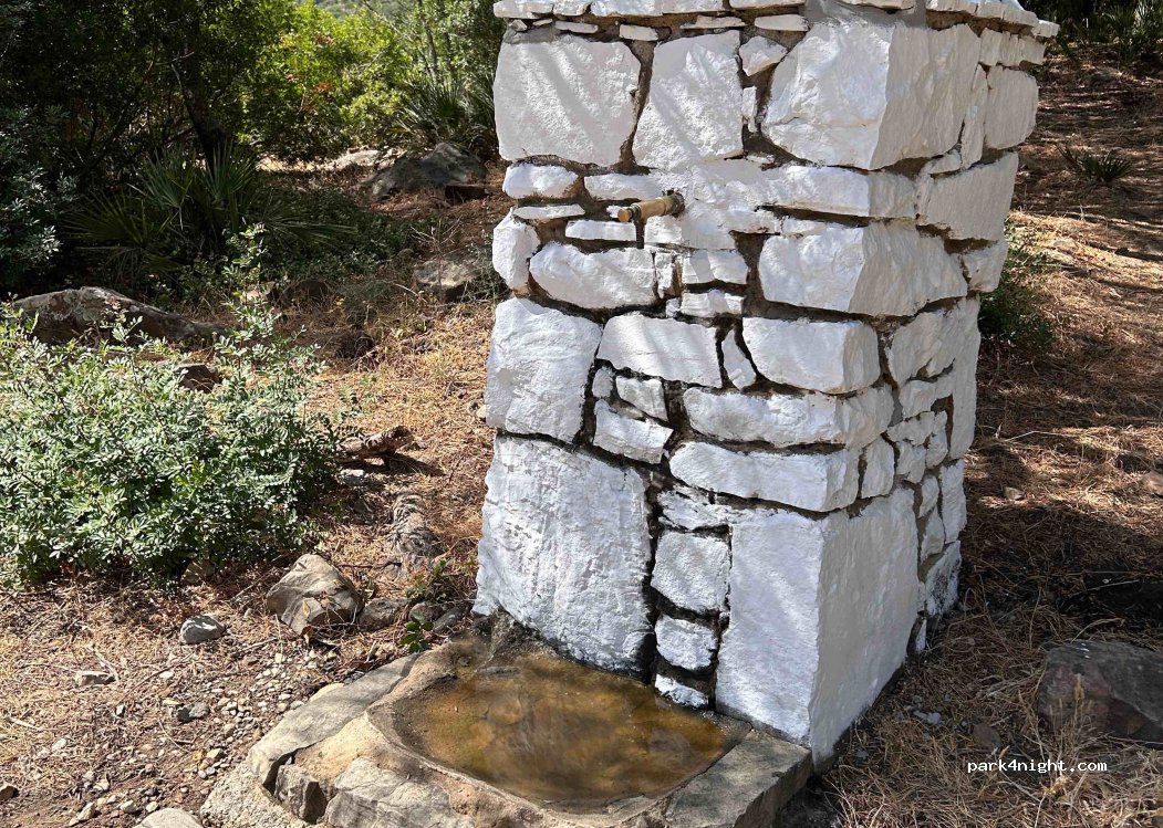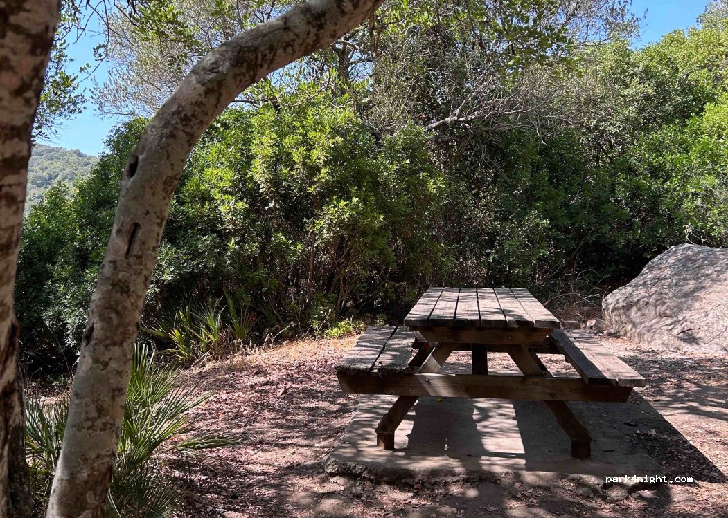 Picknickplatz mit mehreren Tischen und Brunnen. Es gibt einen Grill, der jedoch im Sommer aufgrund der Brandgefahr nicht möglich ist. Es gibt schattige Bereiche.
