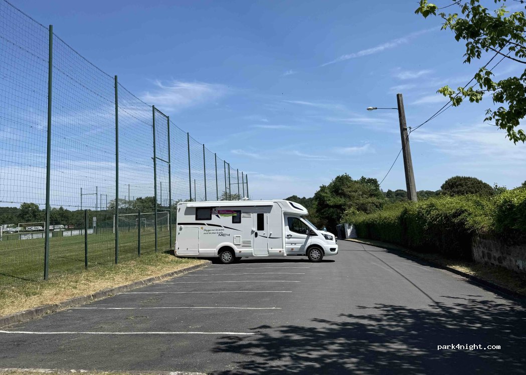 Locatie is ok, maar er zijn weinig plekken waar je horizontaal kan staan (alleen onder aan de grote parkeerplaats ). Correctie voor-achterwaarts en zijwaarts is nodig. Grote campers kunnen niet goed oversteken door laag hangende takken. Tijdens school periode drukte mbt sportactiviteiten in de avond.