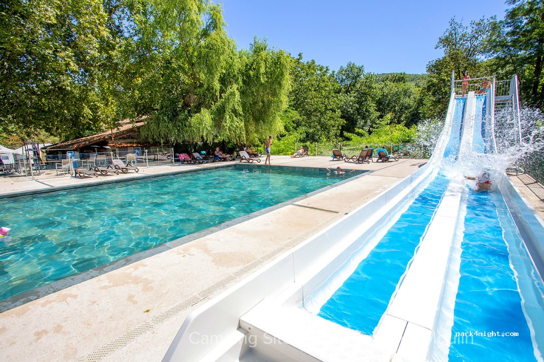 Chouette camping:piscine température agréable et un toboggan adapté aux adultes (autres enfants moins 1m50). Personnel sympa mais un peu débordé. Petit concert le soir très sympa. Bar à cocktails et pain délicieux le matin. Sanitaires un peu vétustes mais propreté ok. PQ et savon disponibles. 55,40 euros/ nuit van 2 enfants et 2 adultes+ électricité. Eau sur emplacement. Attention moustiques!