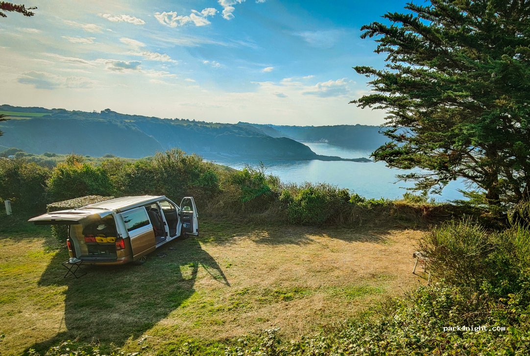 Possibilité de stationner soit sur l’ aire de camping car(pas de vue) , soit sur les emplacements camping surplombant les falaises avec vue juste grandiose et la compagnie de nombreux lapins sur le site . Sanitaires top ! Zone de vidange eaux grises et cassette super fonctionnelle . Camping directement sur le sentier du GR34 . Emplacement camping :18€40 ce jour .
