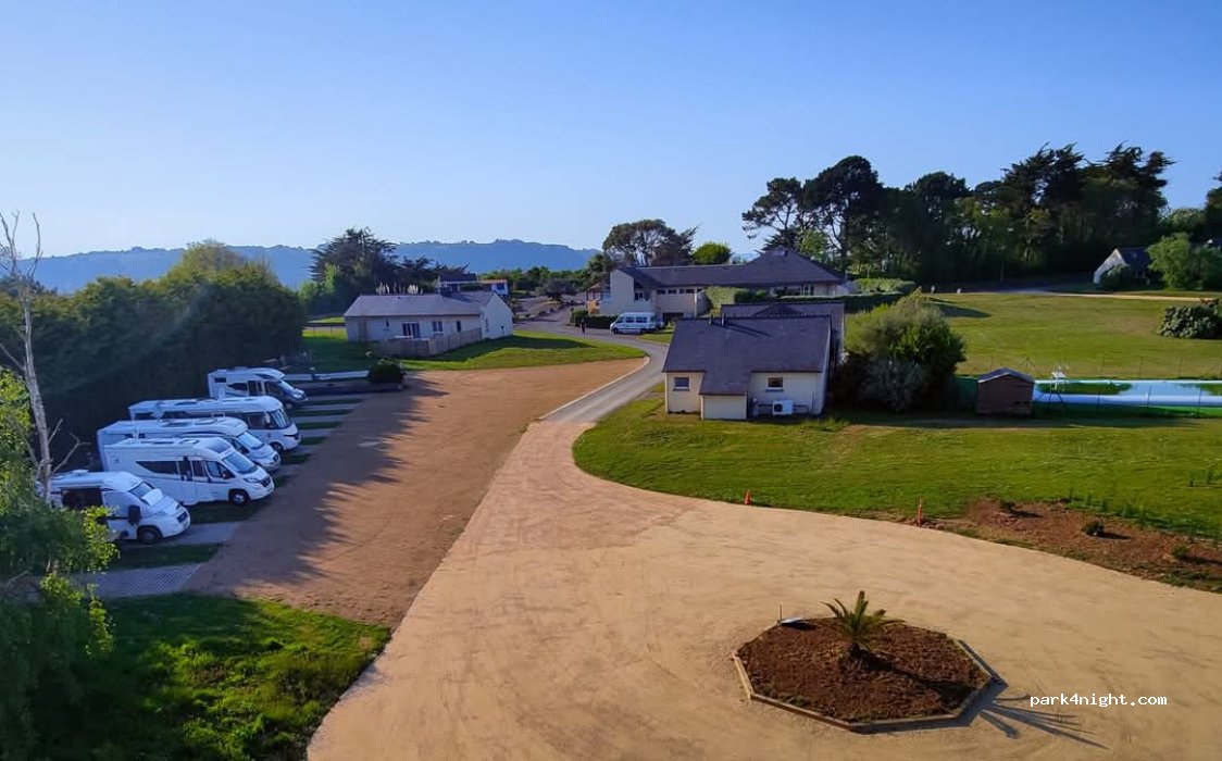une excellente aire ! tout est propre et très calme. acces à un point de vue magique depuis l'aire ainsi qu'au gr 34 . si vous avez moyen de locomotion super pour visiter les alentours. Merci pour l'accueil !
