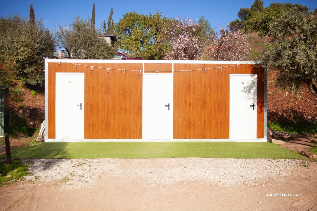 No castle (ambiance). Also stand side by side (like cigarettes in a pack). There is a small shipping container in which 2 small shower cubicles (no dry hanging of clothes possible) and two toilets have been made with underlayment (starting mold). Filling & emptying area of questionable improvised quality, with complaints processed into written warnings. Sorry Adam, but new prices are misplaced.