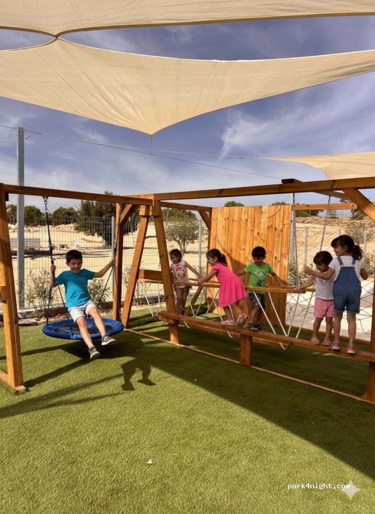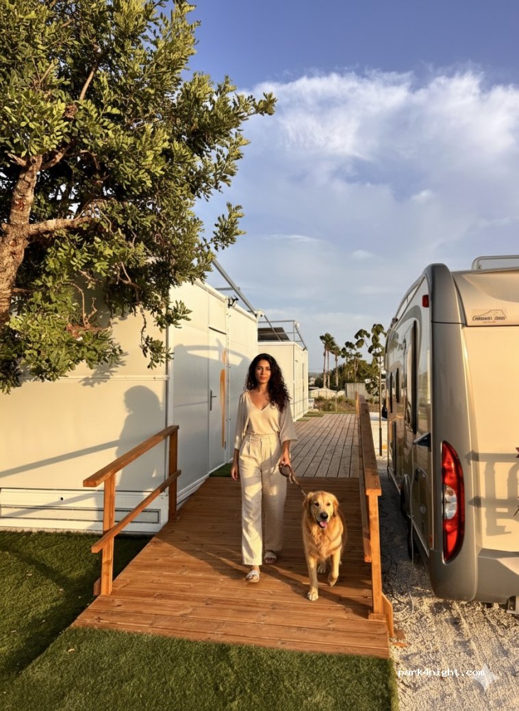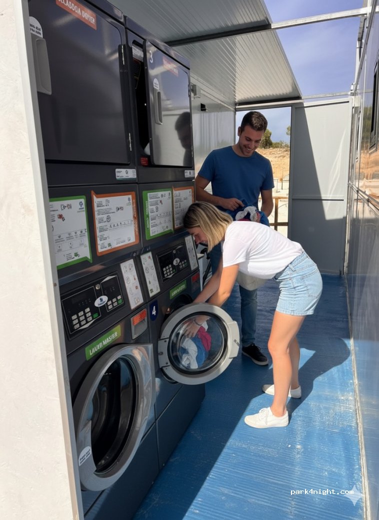 Baños para bebés, baños para mascotas, desagüe químico, lavadoras, secadoras, un minimercado y una zona de relax con piscina y zona de sombra.