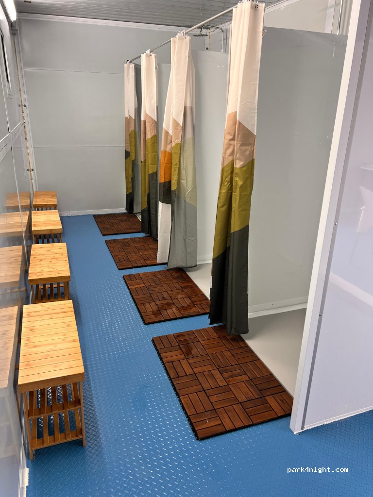 Baby- und Tiertoiletten, Entsorgung für Chemietoiletten, Waschmaschinen, Trockner, ein Minimarkt und ein Ruhebereich mit Swimmingpool und Schattenplatz sind ebenfalls vorhanden.
