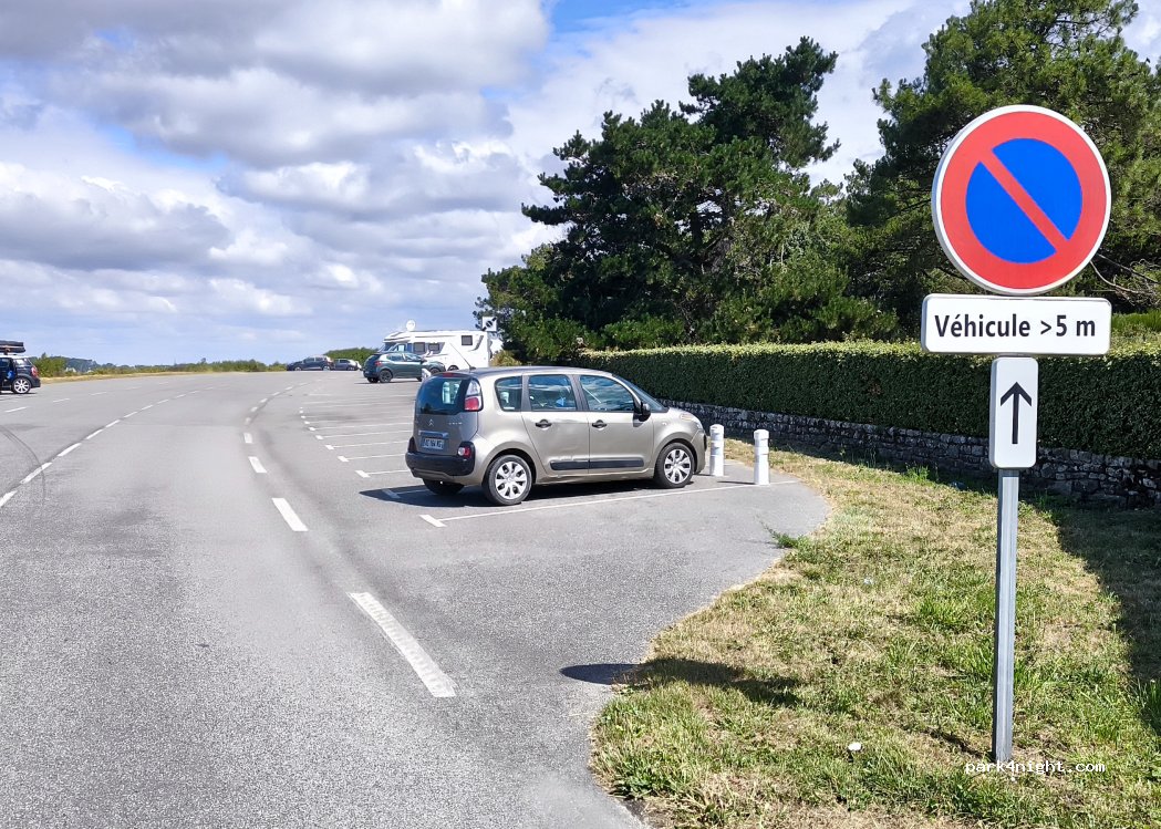 Le parking n'est interdit aux plus de 5 m que sur les quelques premiers emplacements en venant de St Philibert, soit sur à peine 100 m. Aucune interdiction sur le reste du parking.